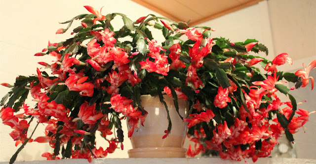 Tämä lienee mehitähti, joka on aikalailla runsaasti koristeltu. Sain kasvin lahjaksi, enkä heti hoksannut, että kysymyksessä on elävä kasvi. Saapa nähdä, jääkö mehitähti henkiin joulukoristeista selvittyään. Eipä ole kokemusta, mutta toivottavasti selviää.
