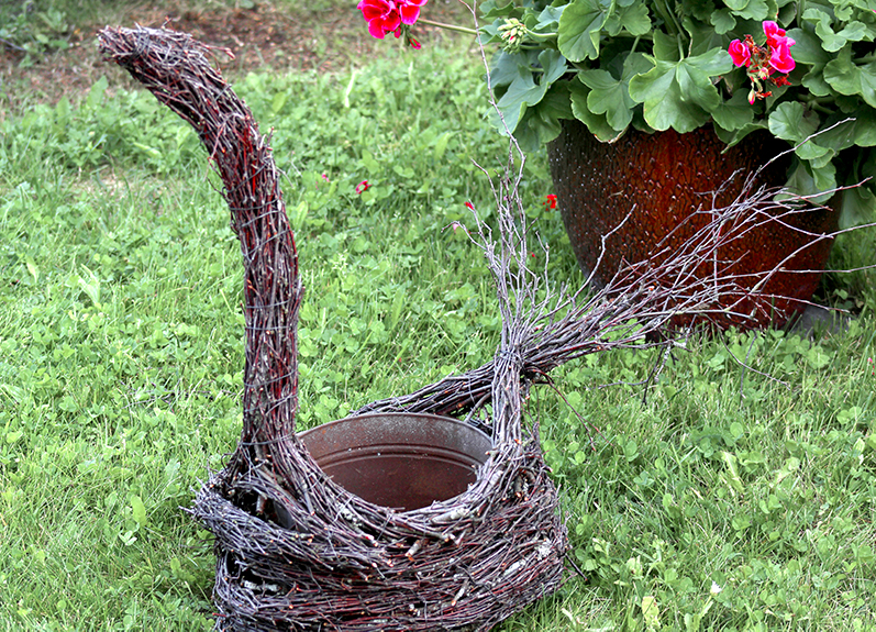 Yhtenä kauniina kesäpäivänä roskasta eli niistä risuista syntyi tällainen musta joutsen. Minulla ei ole mitään käsitystä risutöiden tekniikasta. Kunhan kiertelin risuja ja rautalankaa ruostuneen kukkapurkin ympärille.